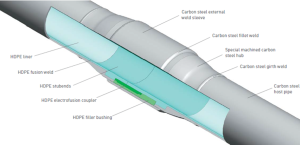 The USTS’s CRA welded connection allows for the connection of two thermoplastic lined sections of steel pipe without the use of flanges. The connection creates an end seal on the thermoplastic liner which is tested to over 9,000 psi and materials are either thermoplastic or corrosion resistant alloy (CRA). Installation and operation comply with pipeline codes: ASME B31.3, ASME B31.4 and ASME B31.8. There are more than 200 of these connectors are installed to date